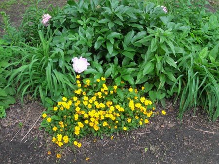 Coreopsis sp. Peony in background.